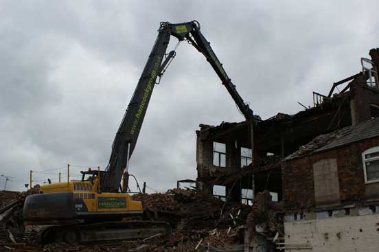 Specialist crane hire was used to reduce some of the structure. Whist a High Reach Excavator fitter with a rotating pulveriser was used for the main works.